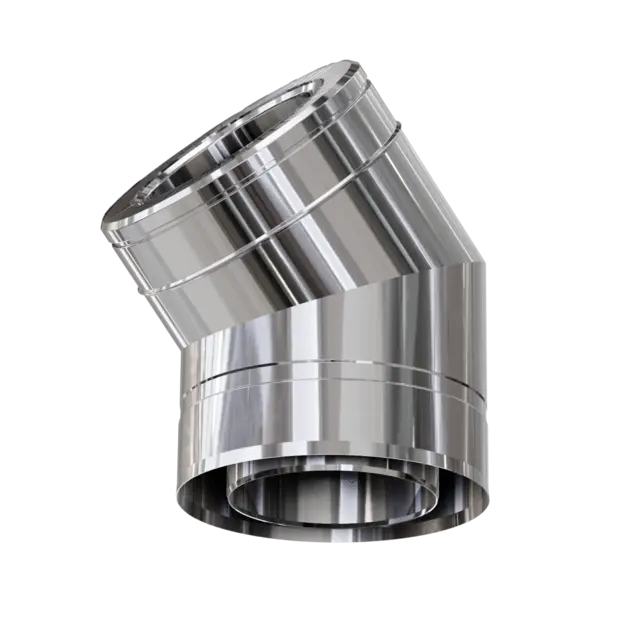 Димохідне двостінне коліно 45° з нержавіючої сталі у нержавіючому кожусі виробництва “Versia-Lux” - забезпечує надійність, легкість монтажу та ефективність димовидалення.