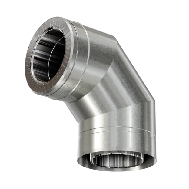 Конструкція: Коліно складається з внутрішньої труби з нержавіючої сталі та зовнішньої труби з оцинкованої сталі, між якими розташований шар базальтової вати товщиною 30-35 мм. Така “сендвіч” конструкція забезпечує теплоізоляцію, запобігає утворенню конденсату та зберігає температуру димових газів, що важливо для підтримання тяги в холодну пору року.